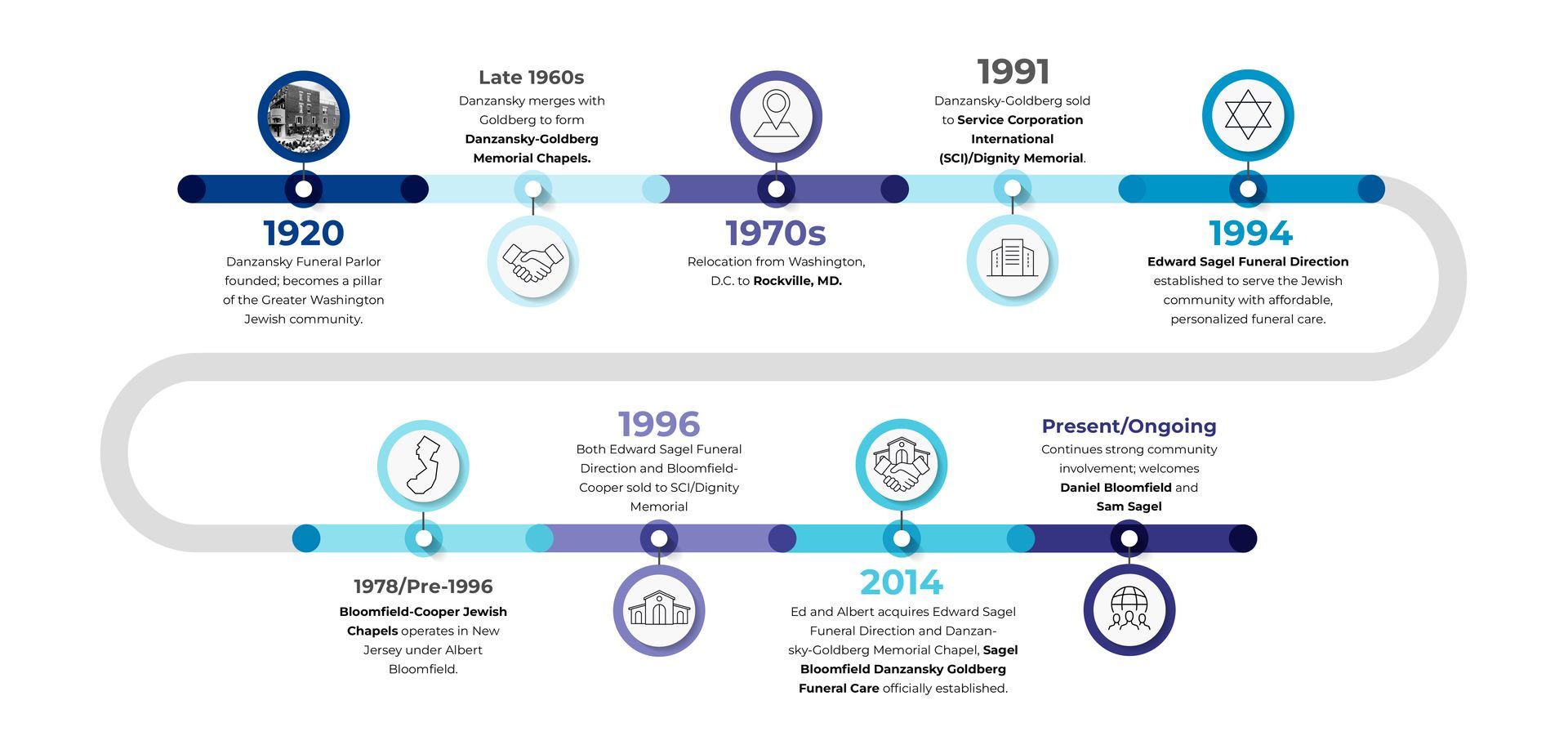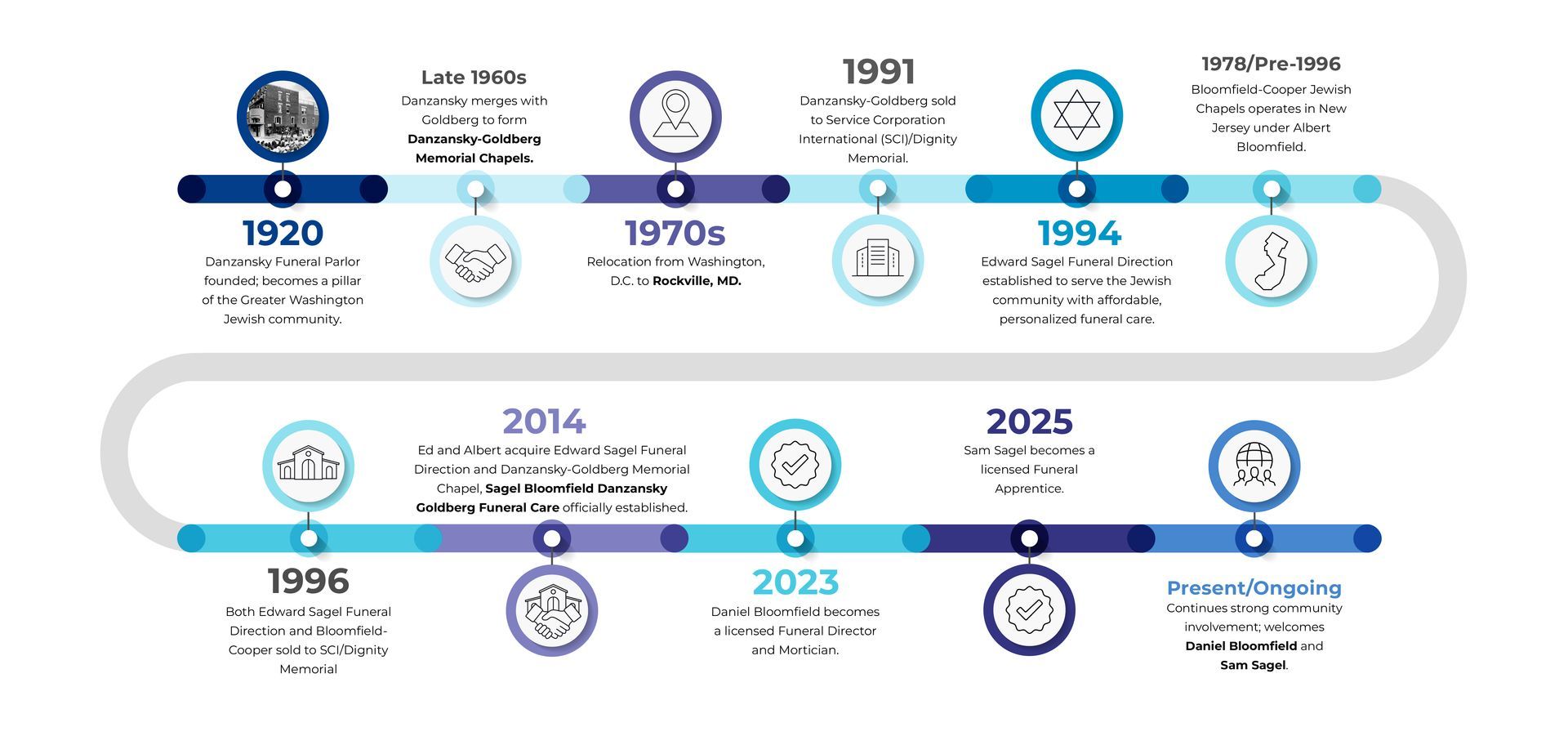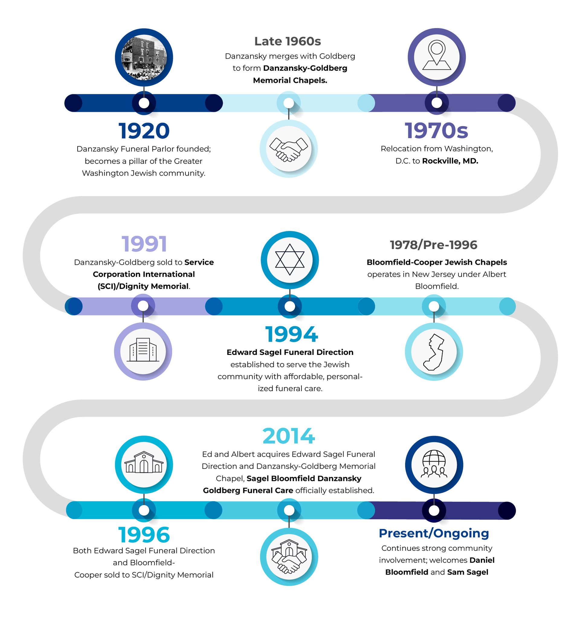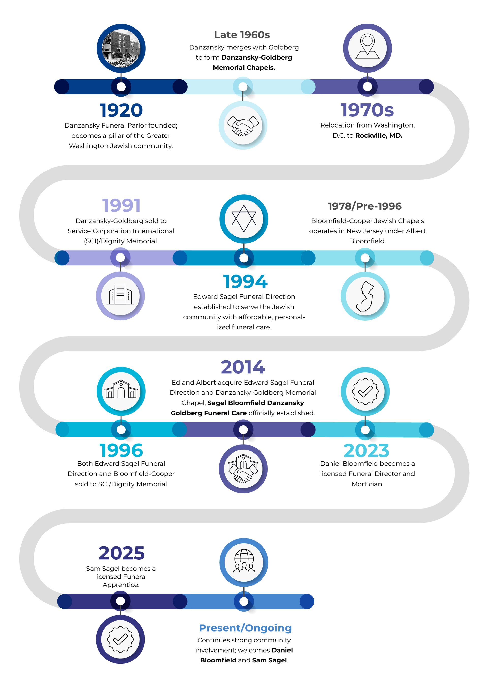 Founded in 1920 as Danzansky Funeral Parlor in Washington, D.C., the firm evolved through mergers and leadership changes. In 1994, Edward Sagel established Edward Sagel Funeral Direction in Maryland, while Albert Bloomfield managed his family’s Bloomfield-Cooper Jewish Chapels in New Jersey. Recognizing the opportunity to serve the greater Washington, D.C., Maryland, and Northern Virginia (DMV) Jewish community, they joined forces in 2014 to create Sagel Bloomfield Danzansky Goldberg Funeral Care, continuing a multi-generational tradition of compassionate service.